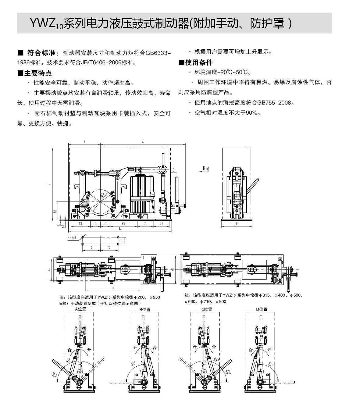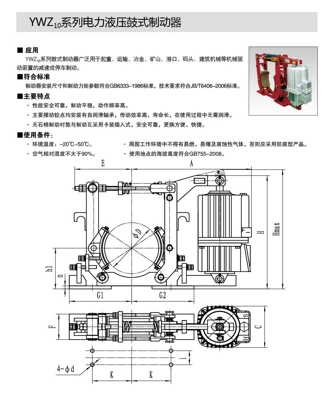 YWZ10,YWZ12系列電力液壓鼓式制動器的連接尺寸和制動力矩參數(shù)符合GB6333-86標(biāo)準(zhǔn),技術(shù)要求符合JB / T6406-2006標(biāo)準(zhǔn),配套符合DIN15430標(biāo)準(zhǔn)的Ed系列推動器。